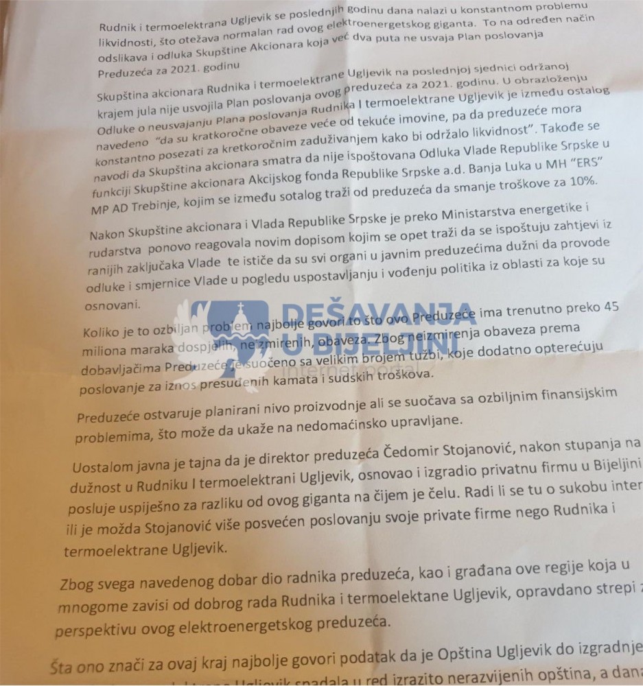 "Rudnik i termoelektrana Ugljevik se posljednjih godinu dana nalazi u konstantnom problemu likvidnosti, što otežava normalan rad ovog elektroenergetskog giganta. To na određen način odslikava i odluka Skupštine Akcionara koja već dva puta ne usvaja Plan poslovanja preduzeća za 2021. godinu", piše u dopisu radnika "RiTE Ugljevik", koji je u posjedu portala dešavanjaubijeljini.