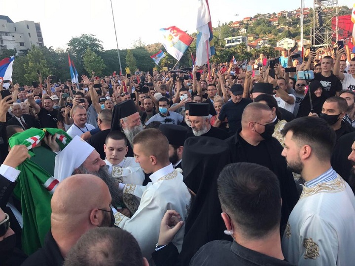 Partijarh Srpske pravoslavne crkve (SPC) Porfirije i mitropolit crnogorsko primorski Joanikije stigli su u Hram Hristovog vaskrsenja u Podgorici a dočekao ih je veliki broj građana. Oni su dočekani uz aplauz i skandiranje "Ne damo svetinje".