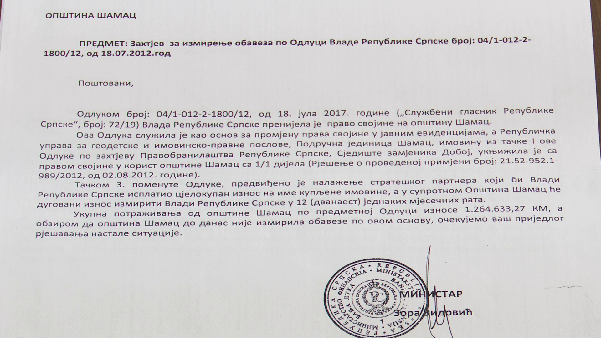 Vlada Republike Srpske i dalje potražuje od opštine Šamac 1.250.000 maraka. Teret dugovanja pao je na ovu lokalnu zajednicu, zbog neuspješne prodaje preduzeća “Hranaprodukt u stečaju”. Problem seže u 2012. godinu.