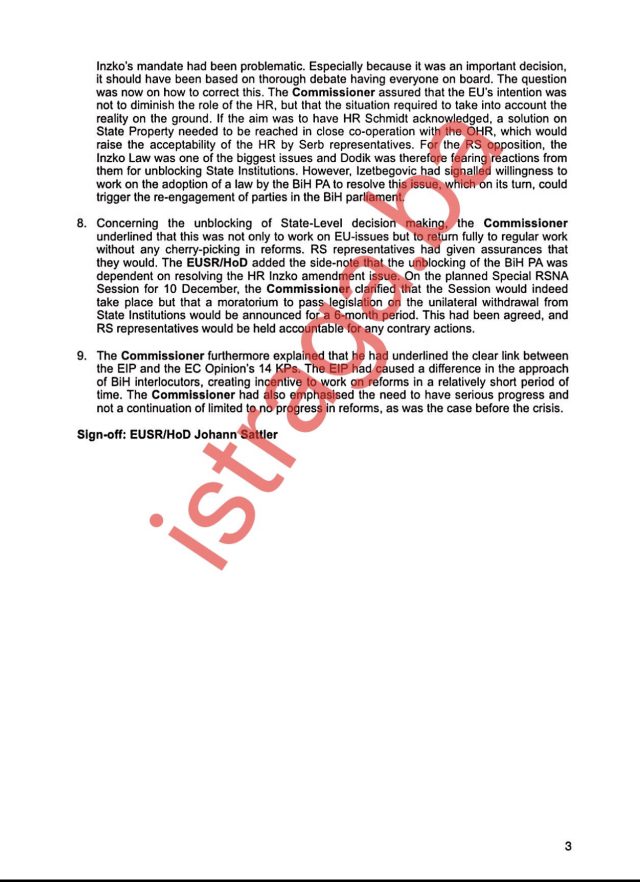 Sattlerov izvještaj je pisan 25. novembra i u tom je dokumentu precizirano da je posebna sjednica NSRS planirana za 10. decembar. Tu treba napomenuti da je Kolegij Narodne skupštine RS tek 7. decembra formalno donio odluku da će posebna sjednica biti održana 10. decembra, odnosno tačno onog datuma koji je u svom izvještaju naveo Johann Sattler, navodeći, pritome, da je “to dogovoreno”, otkriva Istraga.ba.