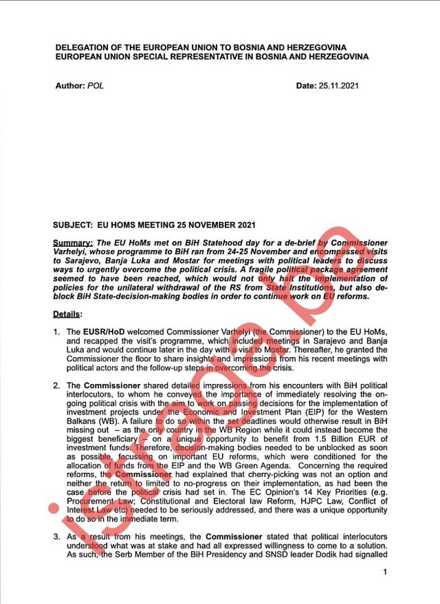 To potvrđuje i izvještaj šefa Delegacije EU u BiH Johansa Satlera, koji je 25. novembra dostavljen u Brisel u kome se navodi da je glavni krivac za krizu – bivši visoki predstavnik u BiH Valentin Incko.