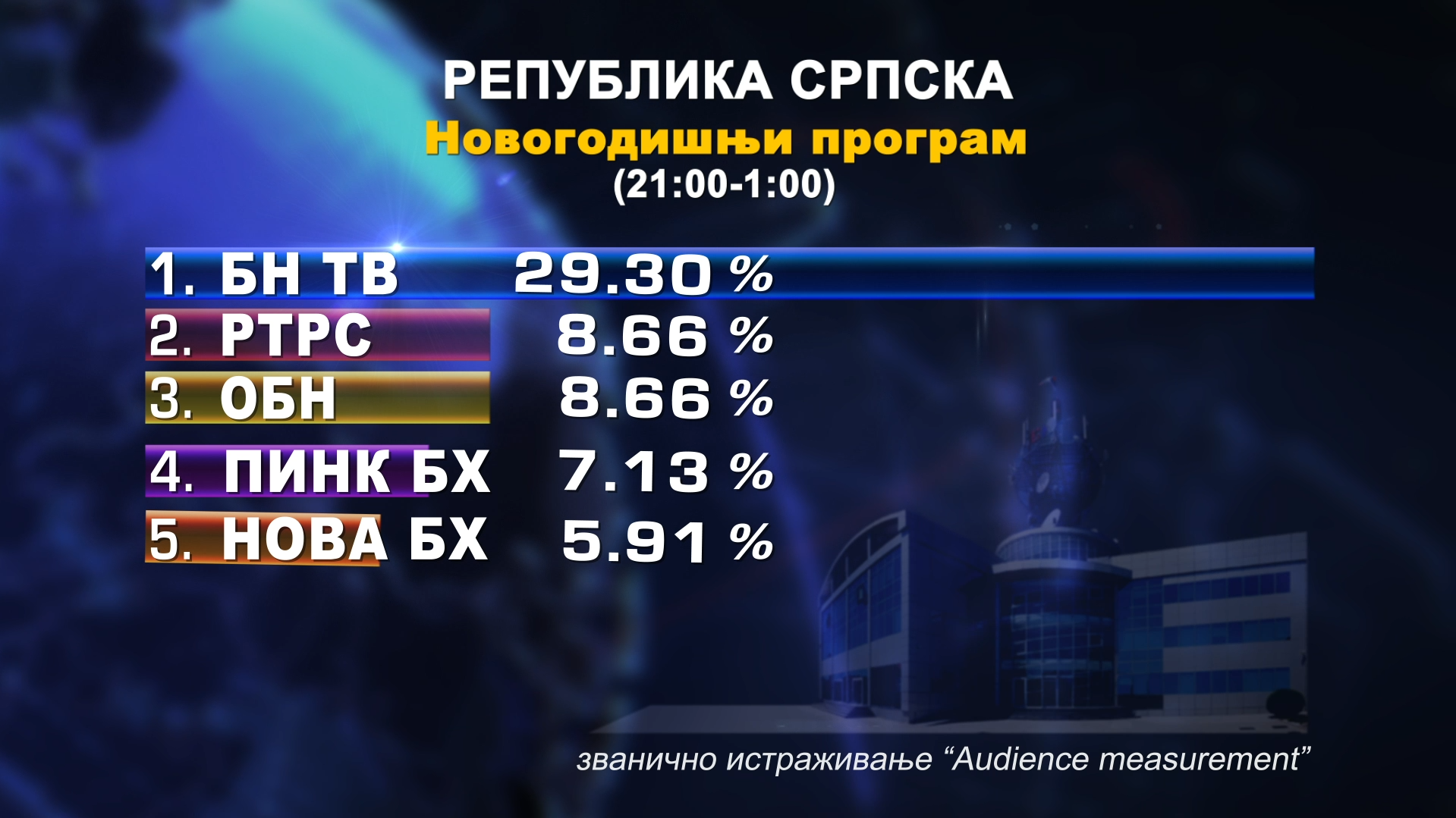 Tako je i u novogodišnjoj noći, na ispraćaju stare i dočeku nove godine, program BN televizije u periodu od 21.00 - 01.00 časova bio najgledaniji u Republici Srpskoj s šerom 29,3%.