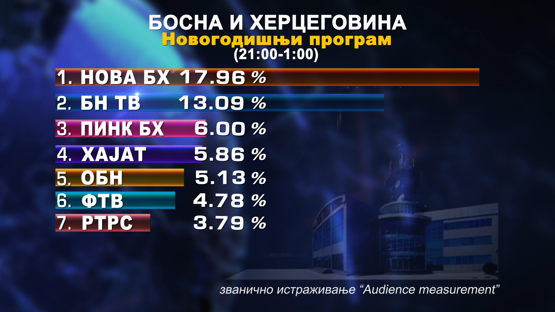Kada je u pitanju gledanost programa u novogodišnjoj noći, u istom periodu, na prostoru cijele BiH, BN televizija je takođe bila u vrhu s šerom 13.09 %.