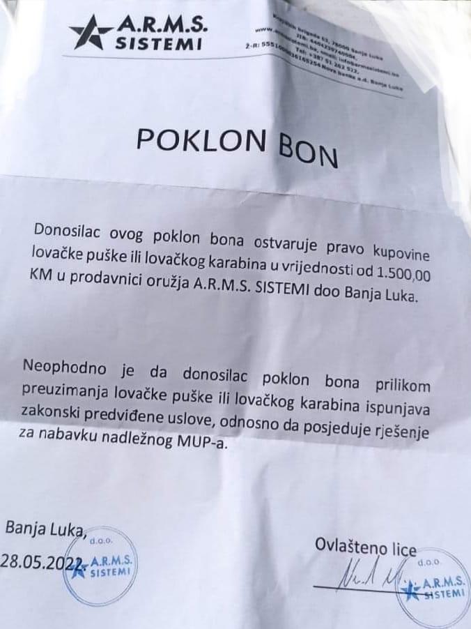 Đajić je ovom prilikom lovcima uručio poklon bonove od 6.000 KM (4 bona po 1500 KM) za kupovinu lovačke opreme.