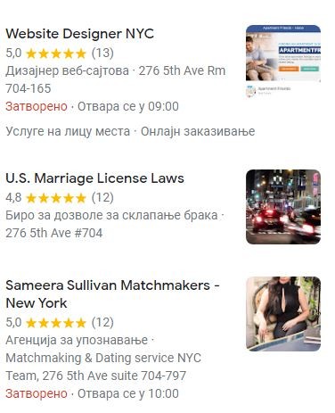 Međutim, na istoj sdresi, i to u istom apartmanu broj 704 pružaju se i usluge poreskih konsultacija, mermernih radova, šetanja pasa, sklapanja brakova, agencije za upoznavanje, party buseva, vidovnjaka i seksualnih terapeuta!