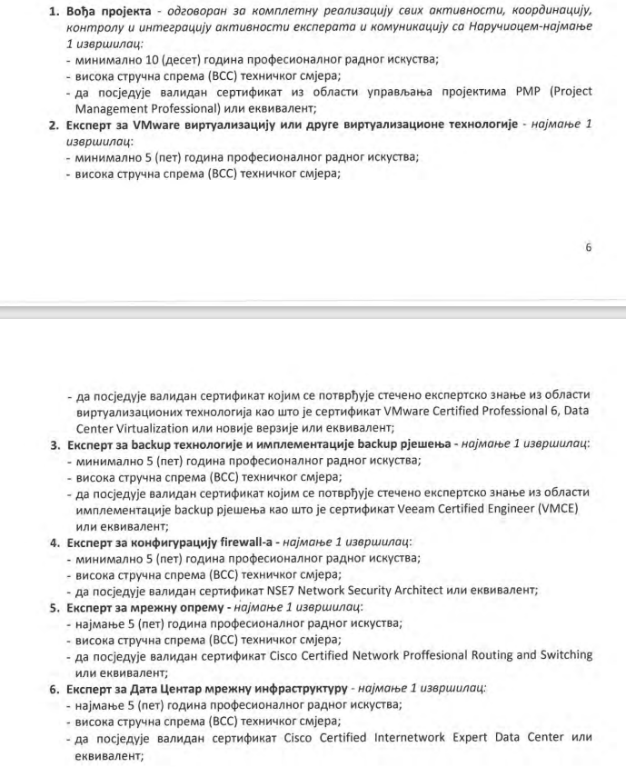 Odabrani IT stručnjaci moraće da imaju uspješnu realizaciju bar jednog ugovora sličnog ovom ponuđenom, čija je vrijednost minimalno 650.000 KM bez uračunatog PDV-a. Osim toga potrebni su mu i eksperti za razne segmente, kojima je propisao i godine iskustva.