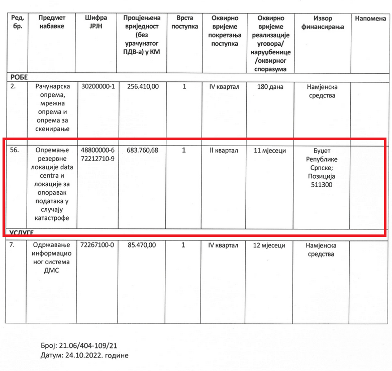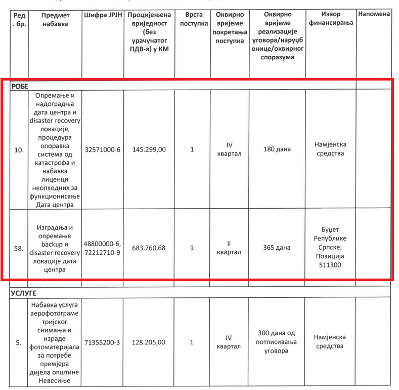 U prvoj izmjeni od 28. marta naveo je da mu je za gore pomenutu cifru potrebna izgradnja i opremanje backup i disaster recovery lokacije data centra, a kao vrijeme realizacije ugovora 150 dana. Sve bi, naravno, išlo na teret budžeta Republike Srpske.
