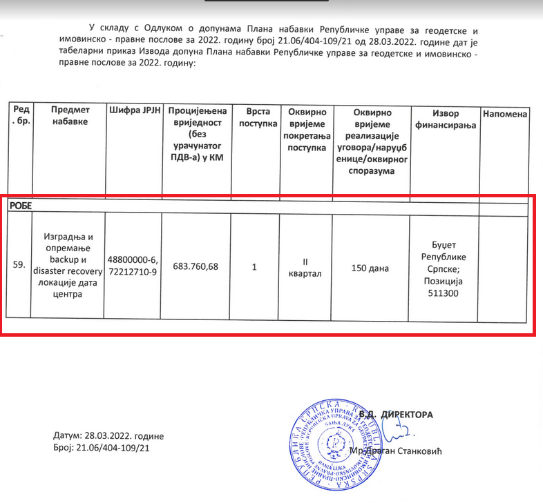 Dragan Stanković, vršilac dužnosti direktora Republičke uprave za geodetske i imovinsko-pravne odnose i kum Milorada Dodika, za „opremanje rezervne lokacije data centra i lokacije za oporavak podataka u slučaju katastrofe“ spreman je da plati 683.760,68 KM. Kada se ovome doda porez na dodatu vrijednost – zanimljiva je cifra 799.999.996 KM. Kvalifikacione uslove i tehničku specifikaciju podesio po sopstvenoj i mjeri podobne firme.