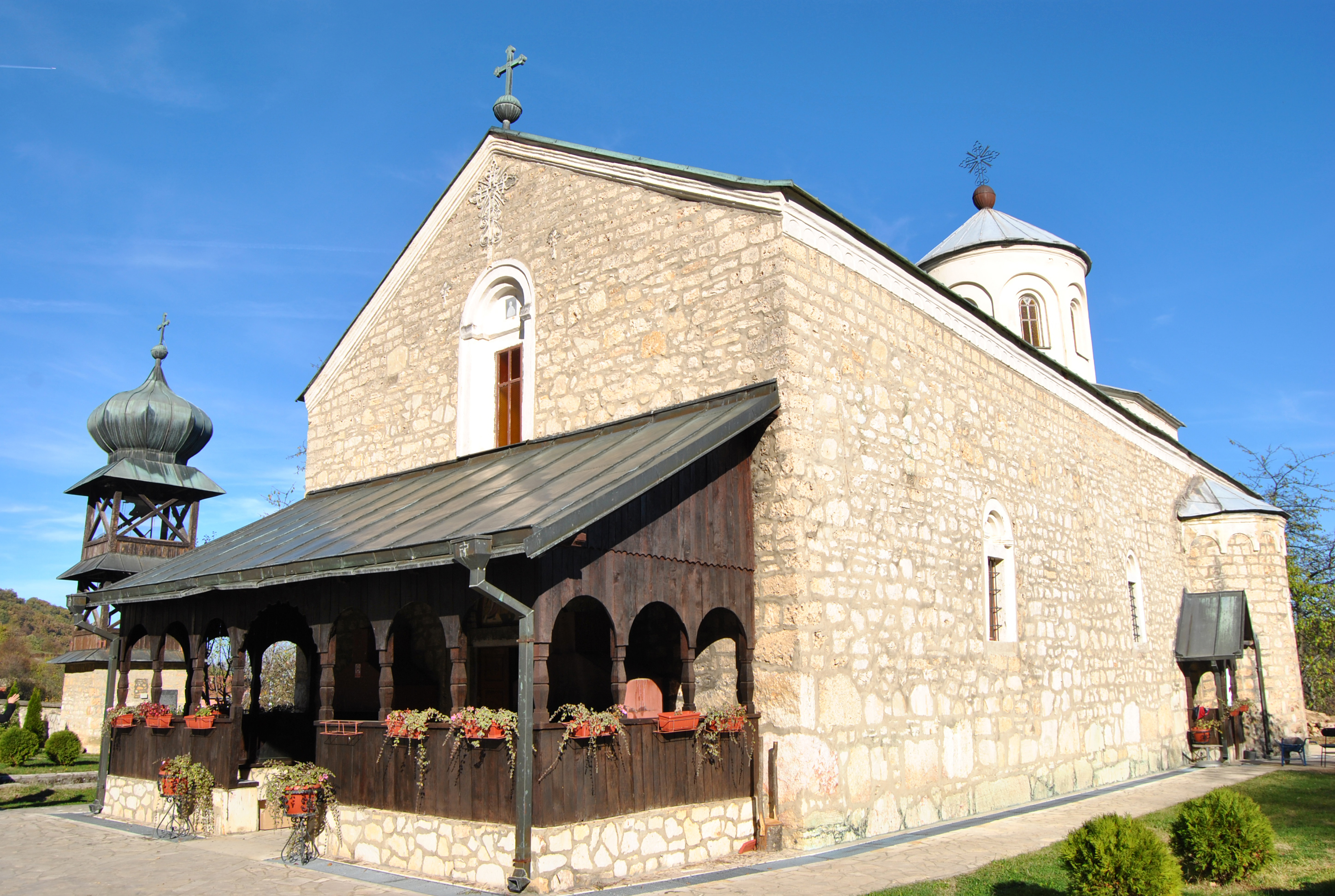 On je rekao da je sredinom 16. vijeka na ovom lokalitetu podignuta monumentalna crkva, današnji hram, sa konacima i obziđem.