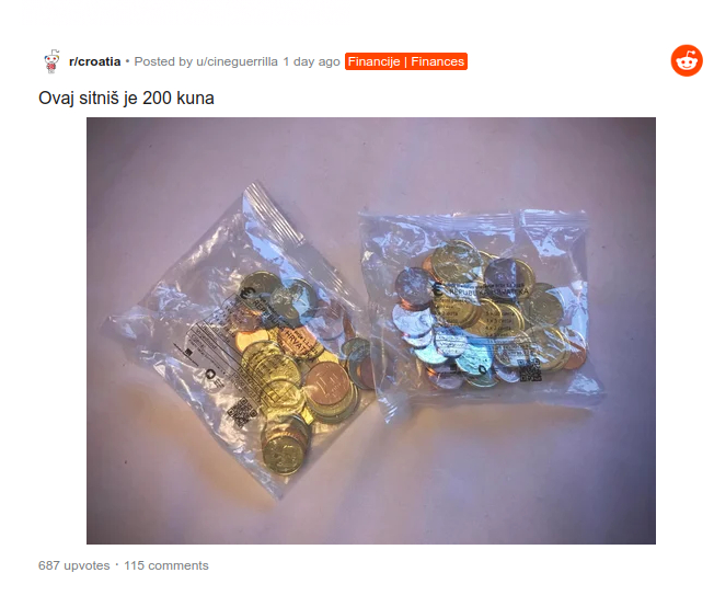 Fotografija paketa kovanica na Reditu objavljena je uz naslov "Ovaj sitniš je 200 kuna" i nizom pitanja: Šta mislite o novom dizajnu evrokovanica? Odgovori su izgledali ovako: Sviđa mi se 74,82 odsto; Ne sviđa mi se 14,96 odsto; Na kovanici uopšte nije trebalo da bude kuna 10,22 odsto.