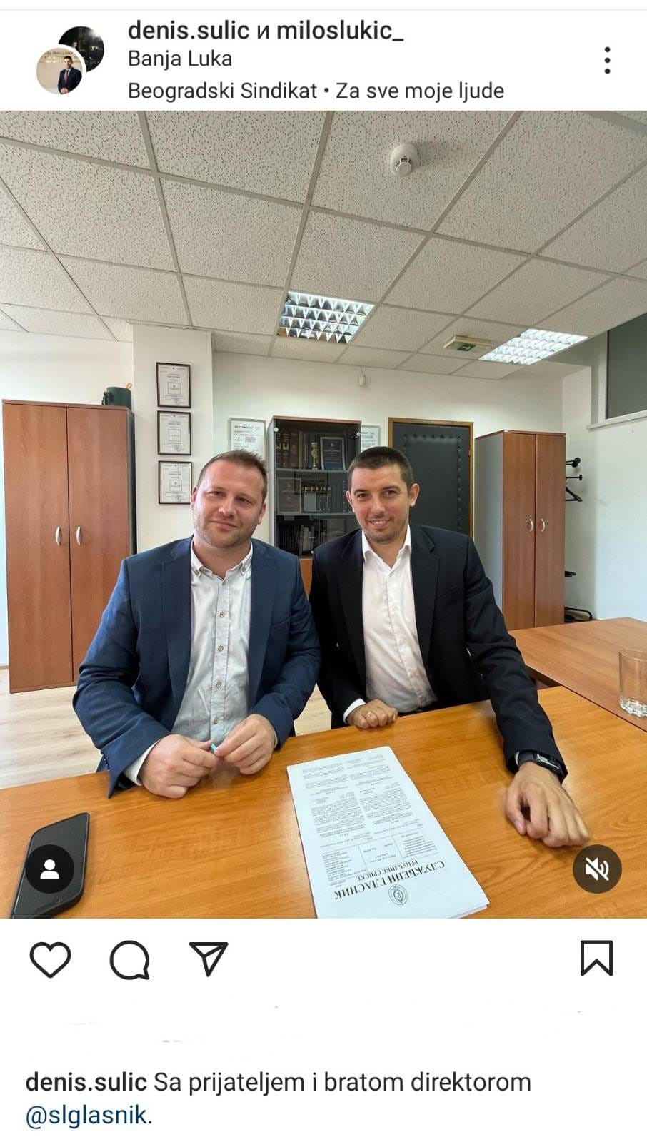 On je objavio i zajedničku sliku sa novim direktorom Službenog glasnika Republike Srpske, uz poruku "Sa prijateljem i bratom direktorom Službenog glasnika".