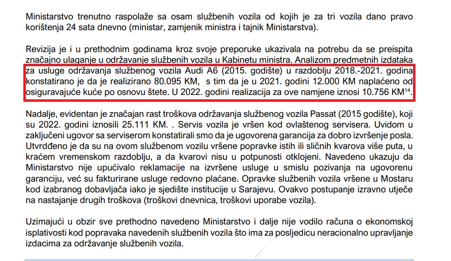 -Analizom predmetnih izdataka za usluge održavanja službenog vozila Audi A6 (2015. godište) u periodu 2018.-2021. godina konstatirano je da je realizovano 80.095 KM, s tim da je u 2021. godini 12.000 KM naplaćeno od osiguravajuće kuće po osnovu štete. U 2022. godini realizacija za ove namjene iznosi 10.756 KM – istaknuli su revizori.