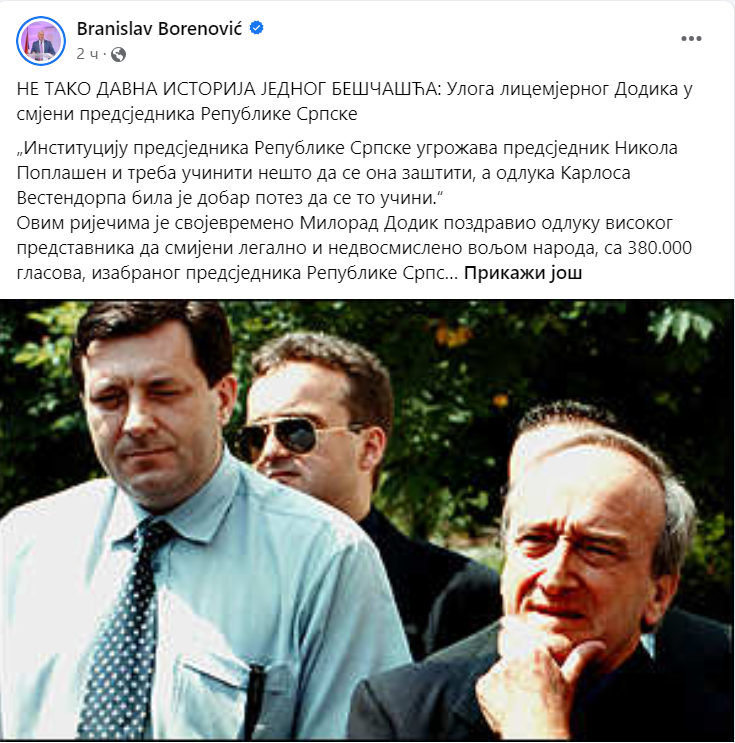 "Ovim riječima je svojevremeno Milorad Dodik pozdravio odluku visokog predstavnika da smijeni legalno i nedvosmisleno voljom naroda, sa 380.000 glasova, izabranog predsjednika Republike Srpske Nikolu Poplašena, iz razloga što je u okviru svojih ustavnih nadležnosti namjeravao da razriješi premijera Dodika", napisao je Branislav Borenović, predsjednik PDP-a na svom fejsbuk profilu.