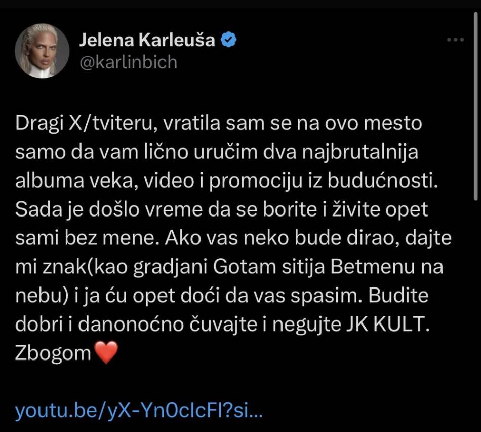 "Dragi X/tviteru, vratila sam se na ovo mesto samo da vam lično uručim dva najbrutalnija albuma veka, video i promociju iz budućnosti. Sada je došlo vrijeme da se borite i živite opet sami bez mene. Ako vas neko bude dirao, dajte mi znak (kao građani Gotam sitija Betmenu na nebu) i ja ću opet doći da vas spasem. Budite dobri i danonoćno čuvajte i negujte JK KULT. Zbogom", napisala je Karleuša.