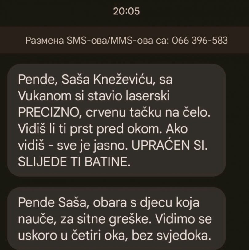 Za sada nepoznata osoba poslala je sa broja 066396583 prvo poruku profesoru Kneževiću u kojoj se kaže „Pende Saša, sa Vukanom stavio si laserski precizno crvenu tačku na čelo...."