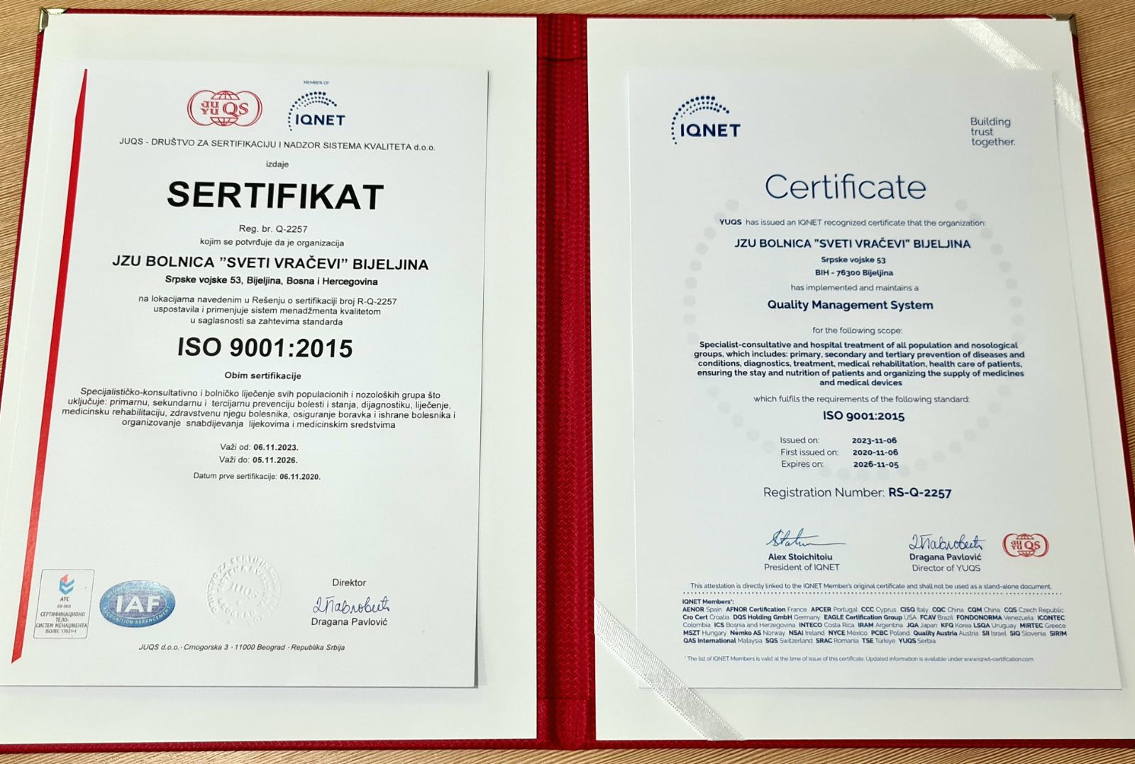JZU Bolnici “Sveti Vračevi” Bijeljina danas su zvanično uručeni sertifikati standarda ISO 9001:2015 i ISO 22301:2019 od strane predstavnika JUQS – Društvo za sertifikaciju i nadzor sistema kvaliteta iz Beograda.