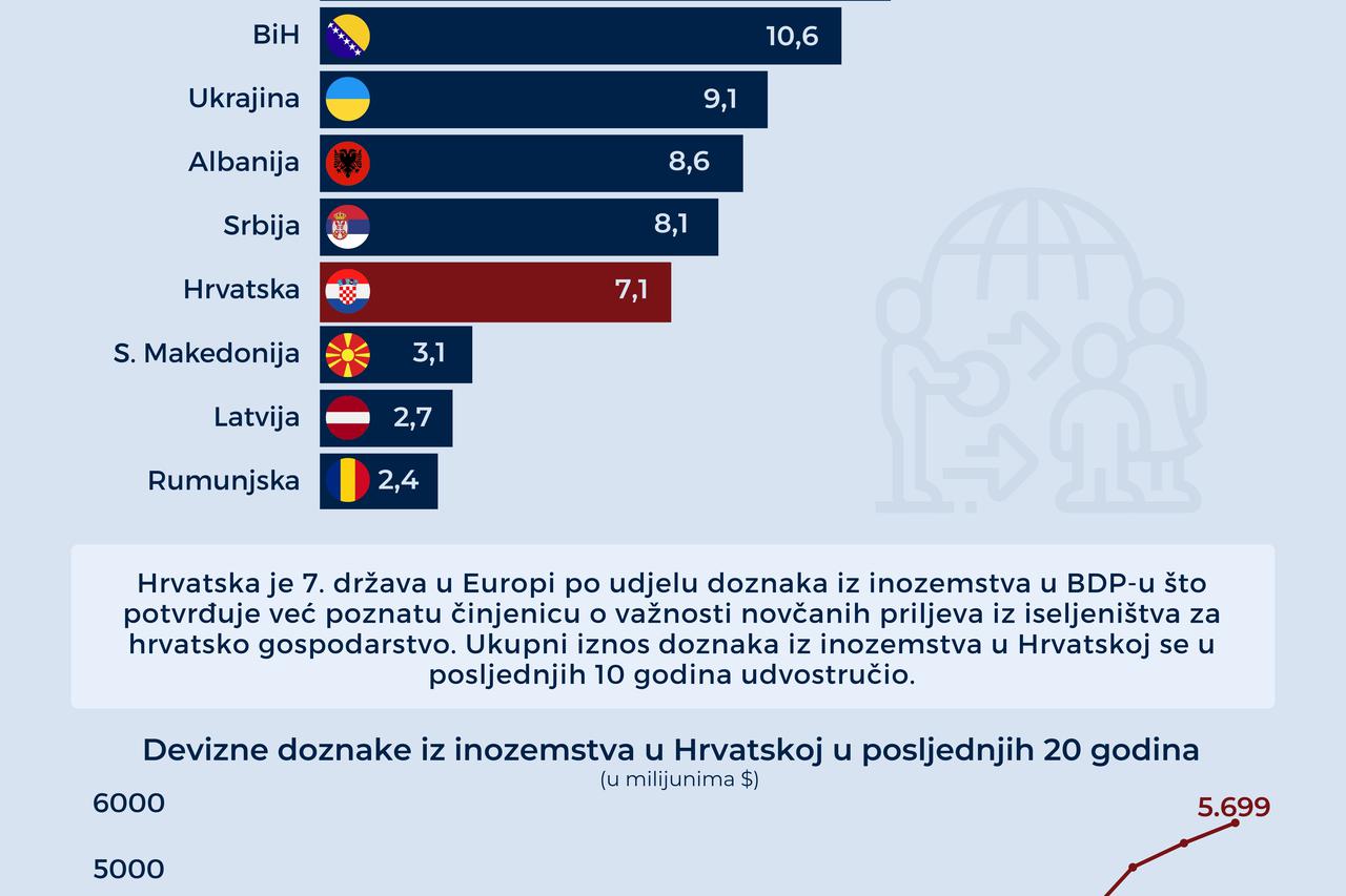 Hrvatska agencija Pixsell objavila je info-grafiku u kojoj je nabrojano 10 evropskih zemalja s najvećim učešćem direktnih doznaka u bruto domaćem proizvodu i na trećem mjestu nalazi se Bosna i Hercegovina sa učešćem od čak 10,6 posto.