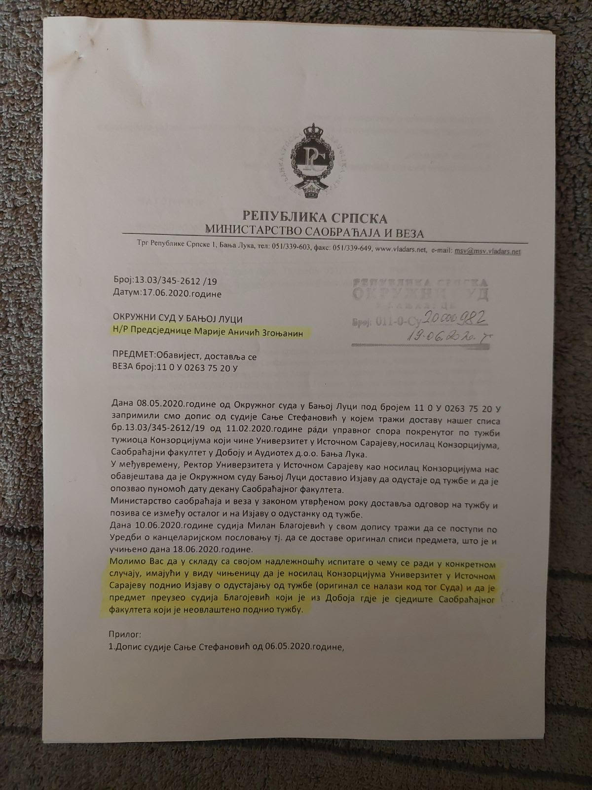 Druga zanimljivost, koja je uslijedila poslije ove prve, je da se Ministarstvo saobraćaja i veza Republike Srpske nakon toga, aktom broj 13.03/345-2612/19 od 17.6.2020. godine, obraća predsjednici Okružnog suda u Banjaluci, tražeći od nje da, kako stoji u tom aktu: