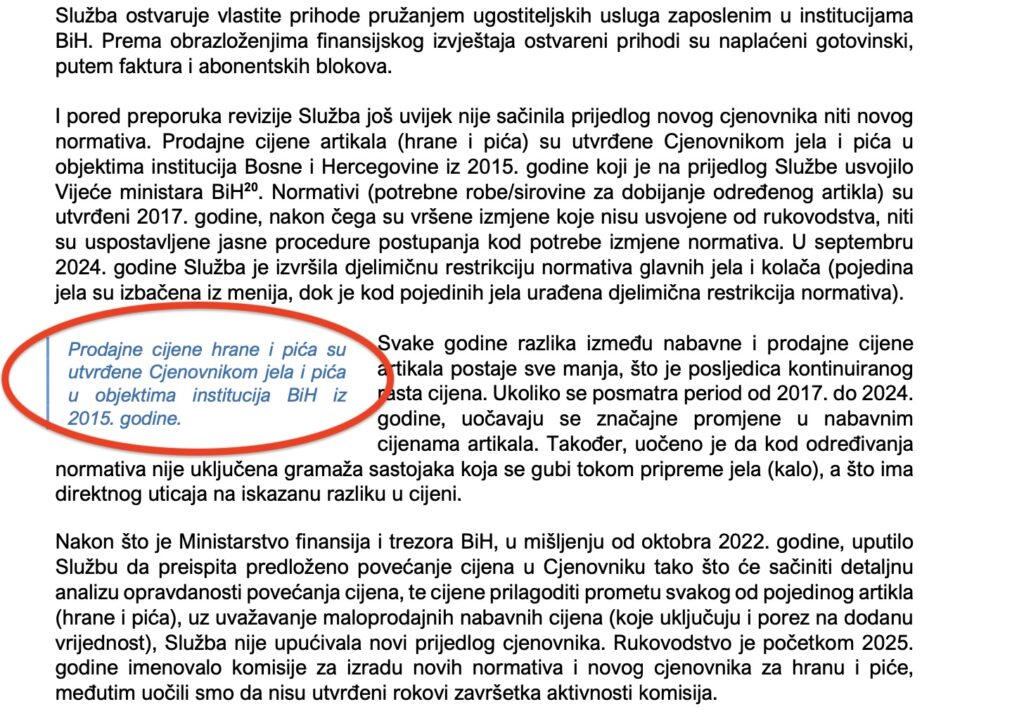 “I pored preporuka revizije Služba još uvijek nije sačinila prijedlog novog cjenovnika niti novog normativa. Prodajne cijene artikala (hrane i pića) su utvrđene Cjenovnikom jela i pića u objektima institucija Bosne i Hercegovine iz 2015. godine. Normativi (potrebne robe/sirovine za dobijanje određenog artikla) su utvrđeni 2017. godine, nakon čega su vršene izmjene koje nisu usvojene od rukovodstva, niti su uspostavljene jasne procedure postupanja kod potrebe izmjene normativa.