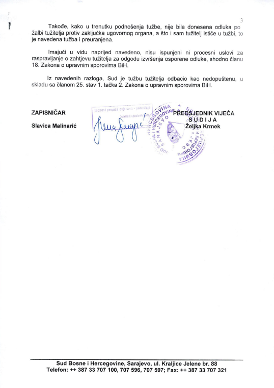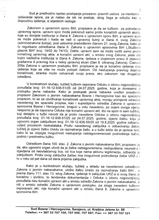 Takođe, kako u trenutku podnošenja tužbe, nije bila donesena odluka po žalbi tužioca protiv zaključka ugovornog organa, a što i sam tužilac ističe u tužbi, to je navedena tužba i preuranjena. Imajući u vidu naprijed navedeno, nisu ispunjeni ni procesni uslovi za raspravljanje o zahtjevu tužioca za odgađanje izvršenja osporene odluke, shodno članu 18. Zakona o upravnim sporovima BiH. Iz navedenih razloga, Sud je tužbu tužioca odbacio kao nedopuštenu, skladu sa članom 25. stav 1. tačka 2. Zakona o upravnim sporovima BiH '- stoji u Rješenju Suda BiH.