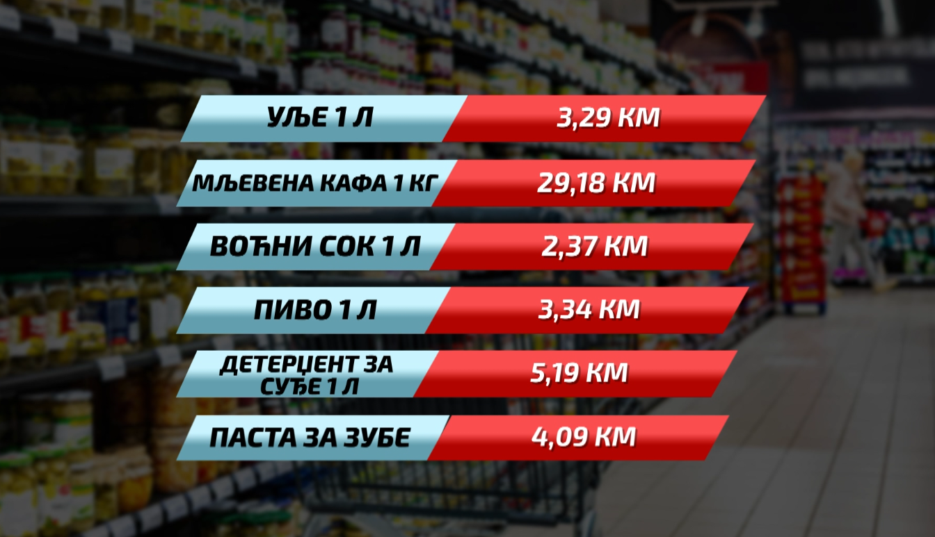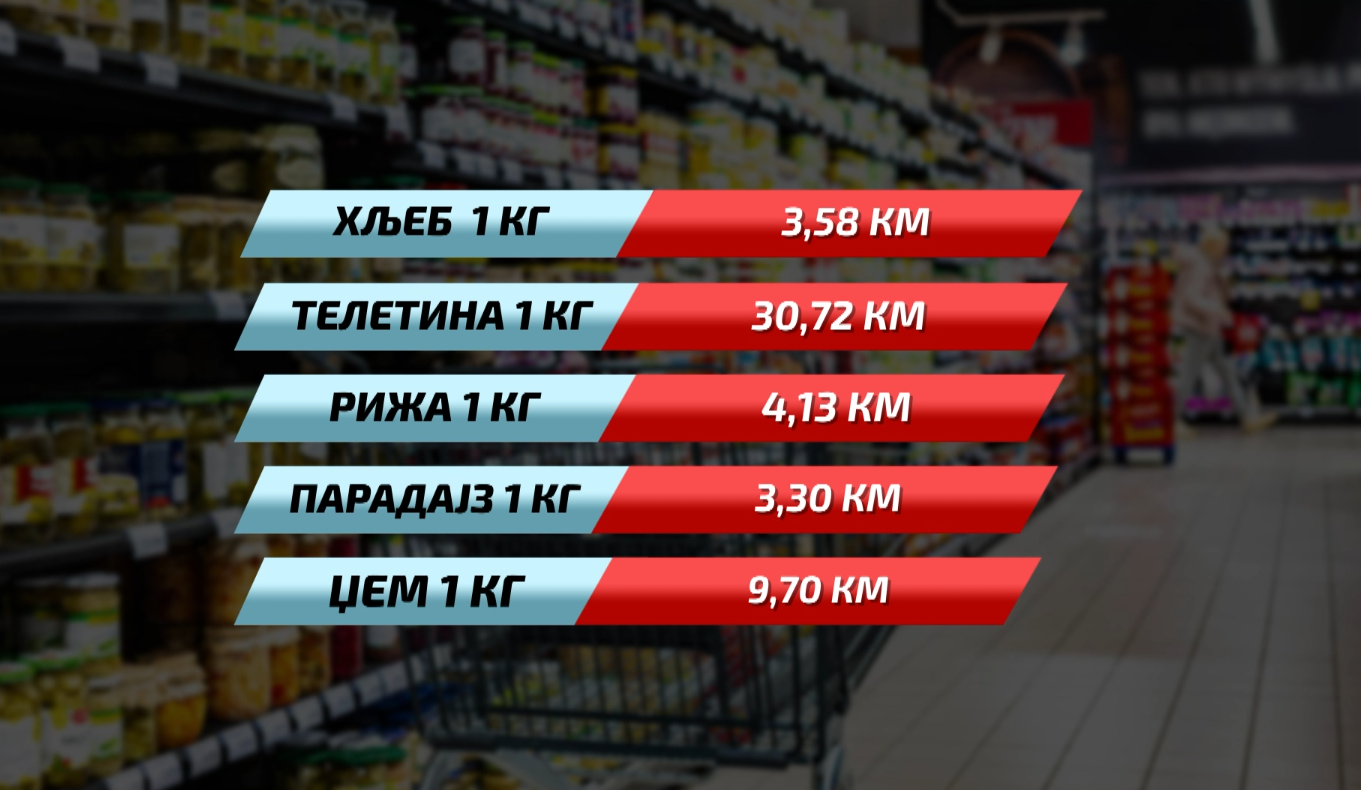 U “statističku korpu“ za pomenuti iznos možemo da stavimo kilogam hljeba koji u prosjeku košta 3,58 KM, kilogram teletine 30,72 KM, kilogram riže 4,13 KM. Paradajz u prosjeku košta 3,30 KM, kilogram džema 9,70 KM, a litar ulja 3,29 KM. Među skupljim proizvodima je mljevena kafa, a za kilogram je potrebno čak 29,18 KM. Litar voćnog soka u prosjeku iznosi 2,37 KM, a litar piva 3,34 KM. itar deterdženta za suđe košta 5,19 KM, dok je za pastu za zube potrebno 4,09 KM.