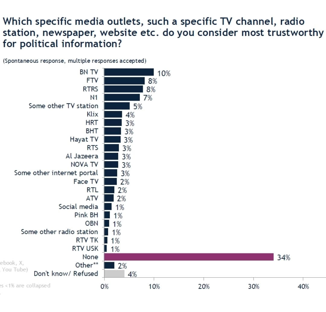 Evo kako su građani Bosne i Hercegovine odgovorili na pitanje "Koje specifične medije poput određenog TV kanala, radio stanice, novina, web stranica ...smatrate najpouzdanijim za političke informacije"?