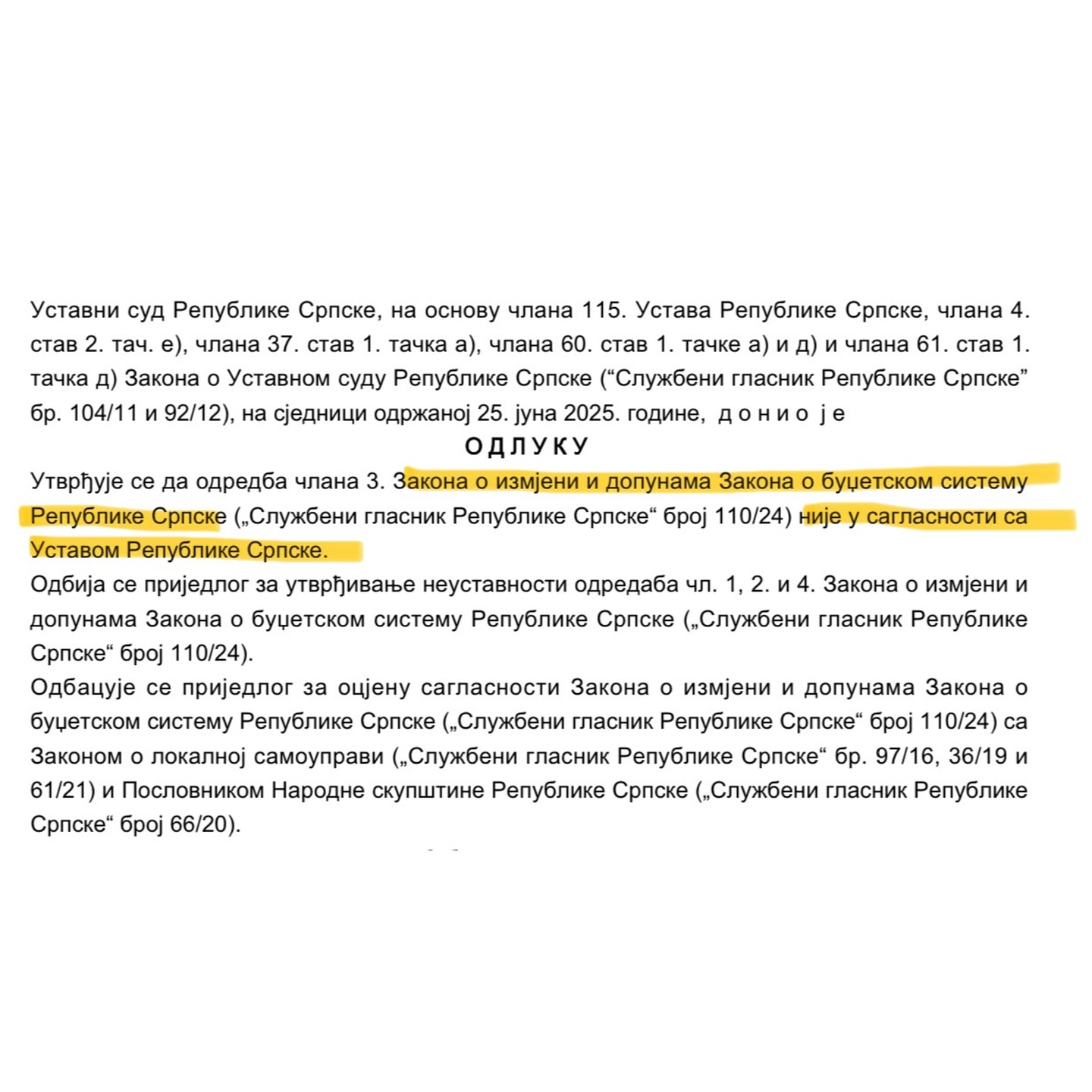 Uz poziv, gradonačelnik je dostavio i Odluku Ustavnog suda Republike Srpske kojom je utvrđeno da oduzimanje PDV-a od Banje Luke nije u saglasnosti sa Ustavom Republike Srpske.