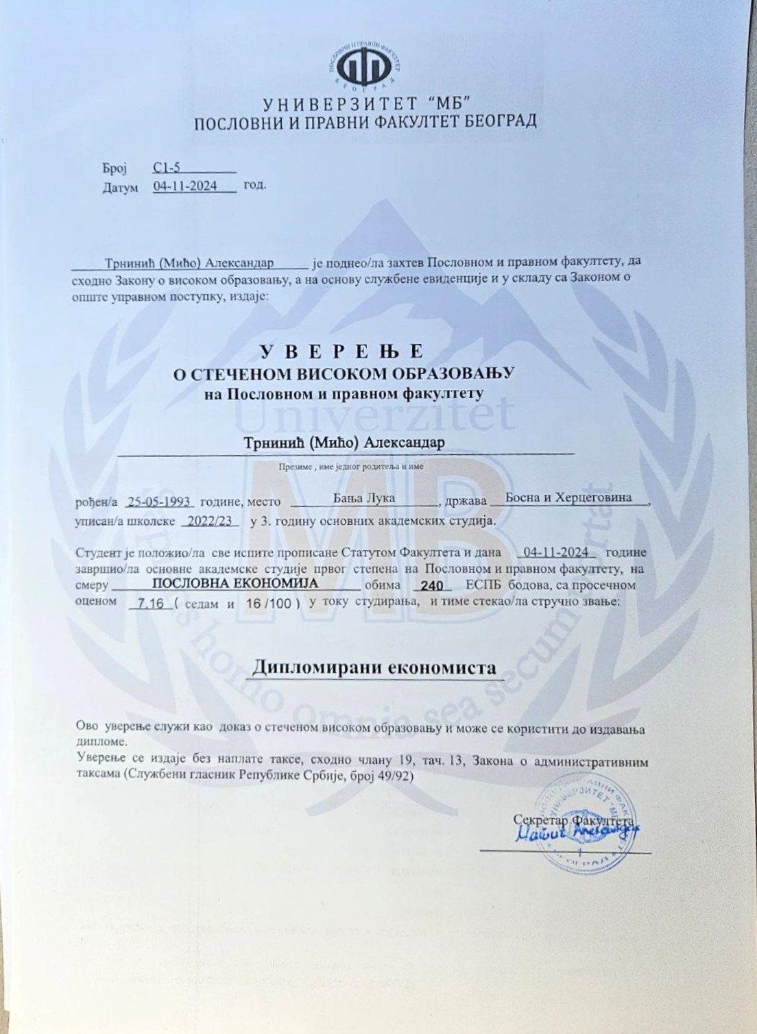 „Aleksandar Trninić je 4.11.2024. godine završio osnovne akademske studije na Poslovnom i pravnom fakultetu, na smjeru Poslovna ekonomija, sa 240 ESPB bodova i prosječnom ocjenom 7,16 stekao zvanje diplomirani ekonomista“, navodi se u uvjerenju.