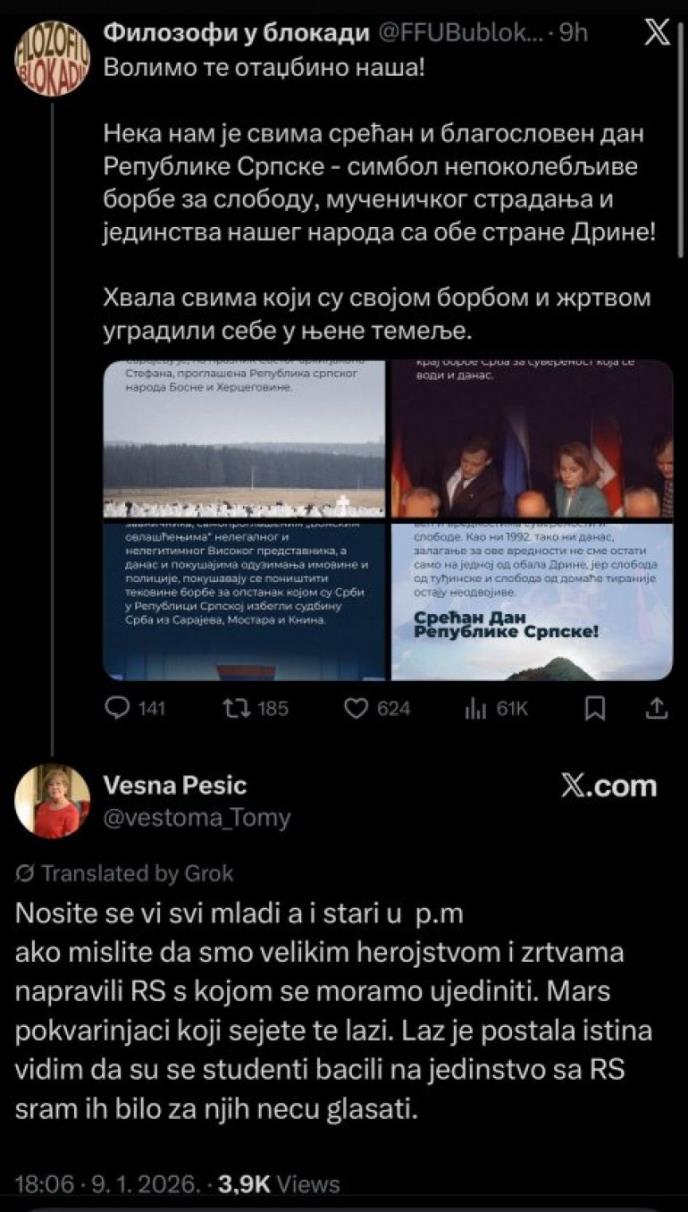 Nalog blokadera sa Filozofskog fakulteta u Beogradu, pokrenuo je potpuni haos na društvenoj mreži Iks (X) i posvađao one koji su, po svemu sudeći, do juče bili uz njih - a sve je krenulo od njihove čestitke za Dan Republike Srpske što se protivnicima aktuelne vlasti nije svidelo!