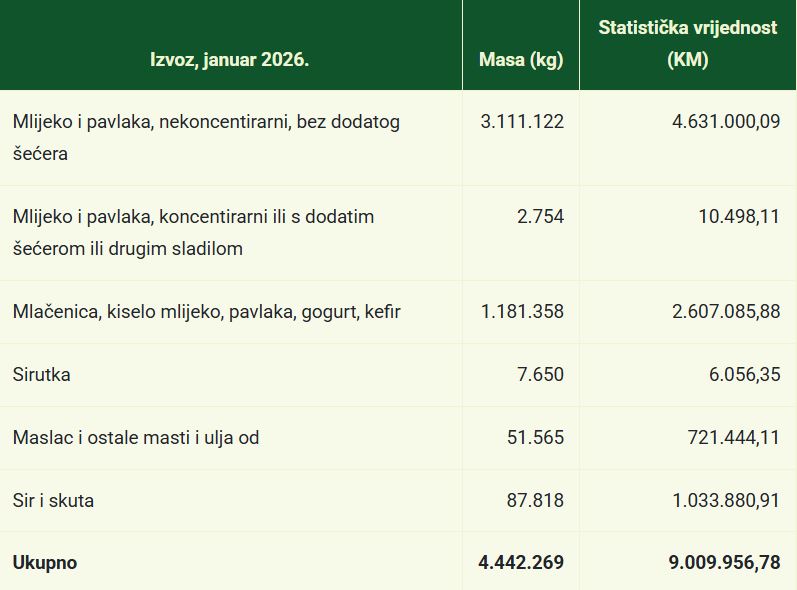 Istovremeno je iz Bosne i Hercegovine, prvog mjeseca 2026. izvezeno 3.111.122 kilograma nekoncentirarnog mlijeka i pavlake, vrijednih 4,6 miliona maraka.
