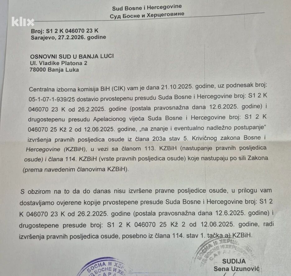 Umjesto toga, Sud BiH i ovaj put krajnje neodređeno traži da se izvrši njegova krivična presuda od 26.2.2025. godine protiv Milorada Dodika, a u njoj nema pa nema ni slova o tome da ona za pravnu posljedicu ima zabranu Miloradu Dodiku da obavlja funkciju predsjednika SNSD-a.