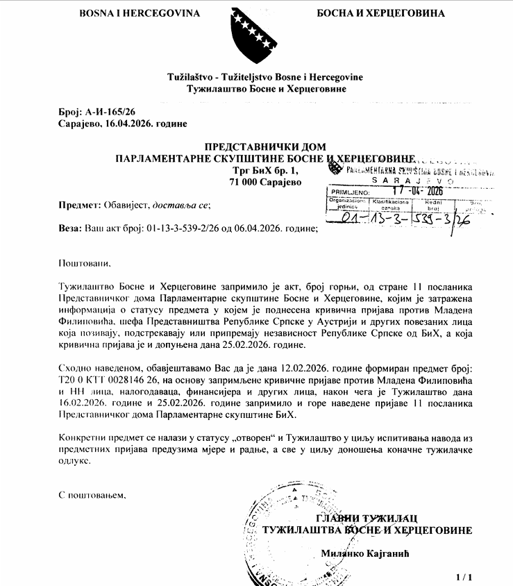 Iz Tužilaštva BiH sada je stigao odgovor u kojem se navodi da je predmet formiran 12. februara 2026. godine, na osnovu zaprimljene krivične prijave protiv Mladena Filipovića, NN lica, te drugih povezanih osoba.