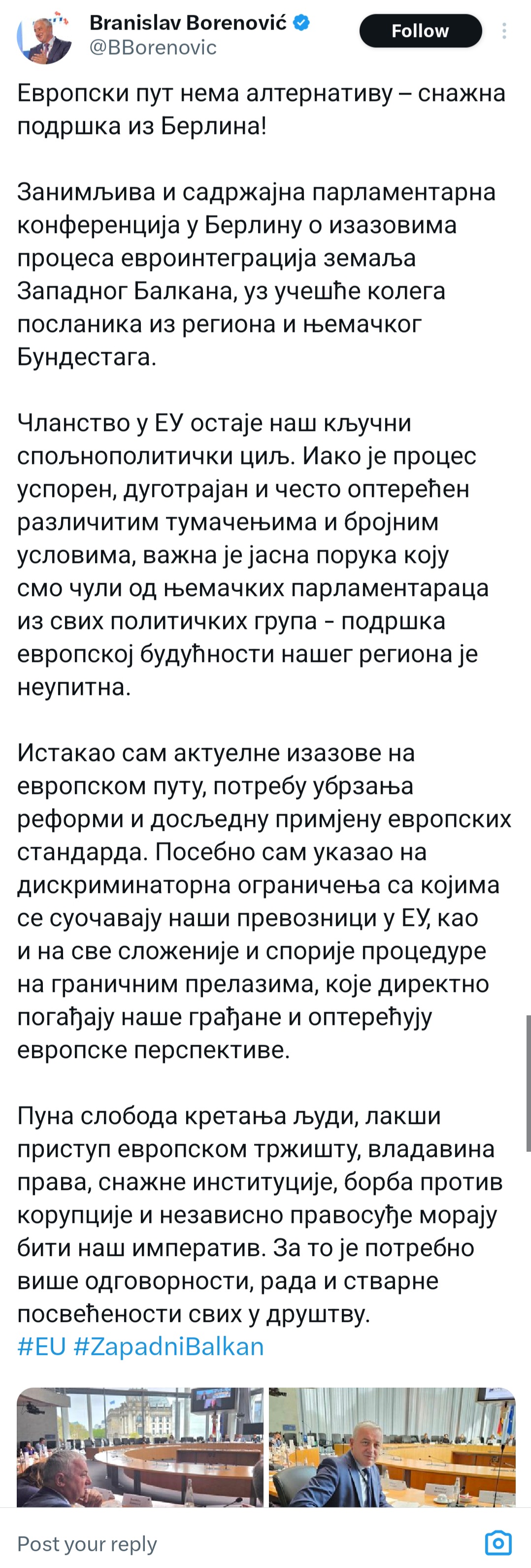 – Iako je proces usporen, dugotrajan i često opterećen različitim tumačenjima i brojnim uslovima, važna je jasna poruka koju smo čuli od njemačkih parlamentaraca iz svih političkih grupa – podrška evropskoj budućnosti našeg regiona je neupitna – kaže Borenović.