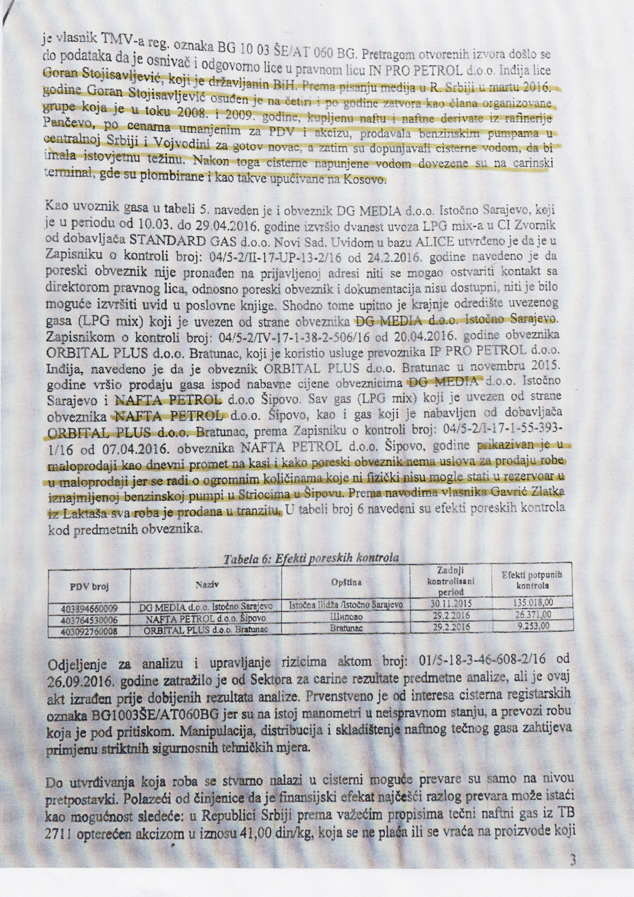 "Претрагом отворених извора дошло се до података да је оснивач и одговорно лице те фирме, заправо, правно лице "ИН ПРО ПЕТРОЛ" из Инђије, односно Горан Стојисављевић, који је држављанин БиХ са тренутним боравком у Инђији у Србији.