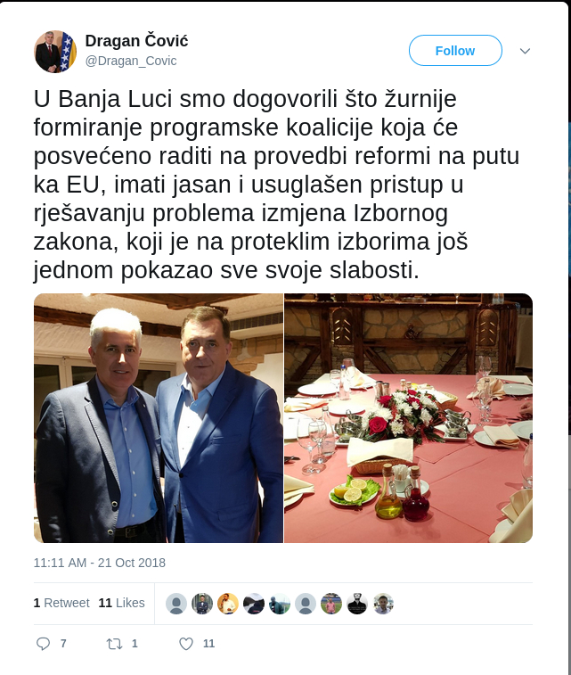 "У Бањалуци смо договорили што хитније формирање програмске коалиције која ће посвећено радити на провођењу реформи на путу ка ЕУ, имати јасан и усаглашен приступ у рјешавању проблема измјена Изборног закона, који је на протеклим изборима још једном показао све своје слабости", написао је Човић након састанака на Твитеру.