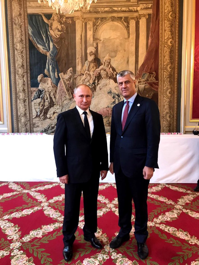 После проблема који је настао због распореда седења светских лидера на церемонији обележавања завршетка Првог светског рата у Паризу, превасходно због тога што се косовски председник Хашим Тачи нашао у другом реду, одмах иза председника Русије Владимира Путина, дошло је до сусрета Путина и Тачија.