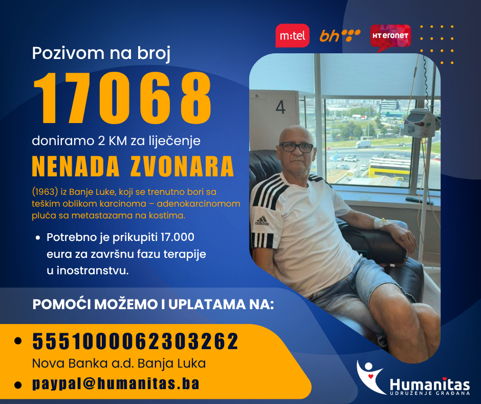 Хуманитас покреће донаторску акцију за лијечење Ненада Звонара (1963) из Бањалуке, који се тренутно бори са тешким обликом карцинома – аденокарциномом плућа са метастазама на костима.