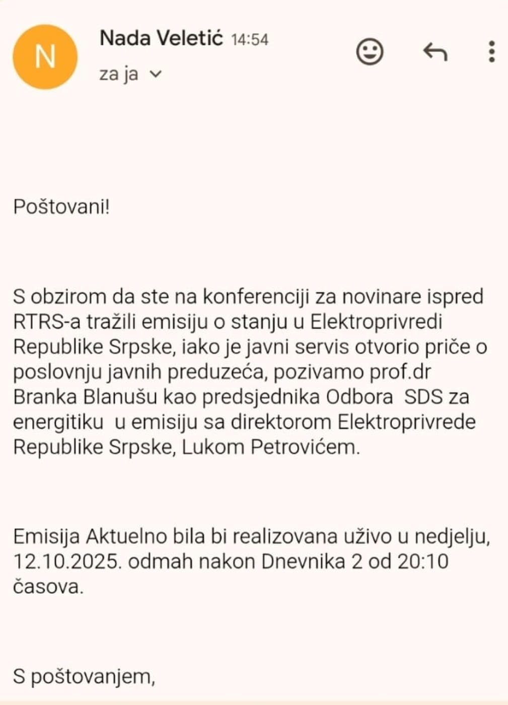Одмах након Додиковог твита из РТРС је упућен захтјев предсједнику Одбора за енергетику проф. др. Бранку Блануши да учествује у емисији заједно са директором Електропривреде Републике Српске Луком Петровићем.