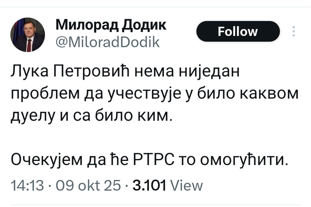 - Лука Петровић нема ниједан проблем да учествује у било каквом дуелу и са било ким. Очекујем да ће РТРС то омогућити, написао је Милорад Додик на x налогу.