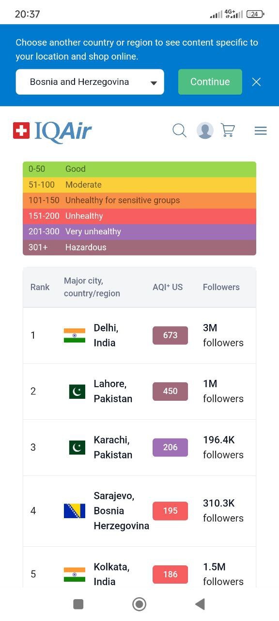 Вечерас се густи облак опет спустио на град, а према неким специјализираним страницама које прате загађење зрака у свијету - Сарајево је тренутно четврти најзагађенији зрак на планети.