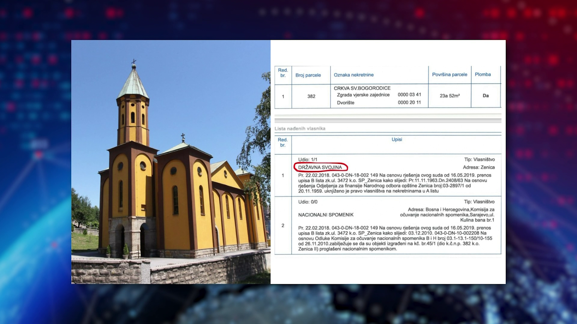 Из Општинског суда у Зеници за БН телевизију појашњавају да је „државна својина“ над црквом уписана још 11. новембра 1963. године. Суд се позвао на Закон о национализацији из 1958. године, којим је тадашња држава одузимала имовину, остављајући Цркви само право коришћења. Приликом савремене хармонизације 2019. године, тај стари упис је једноставно преписан у нове књиге, а да власник о томе није директно консултован.