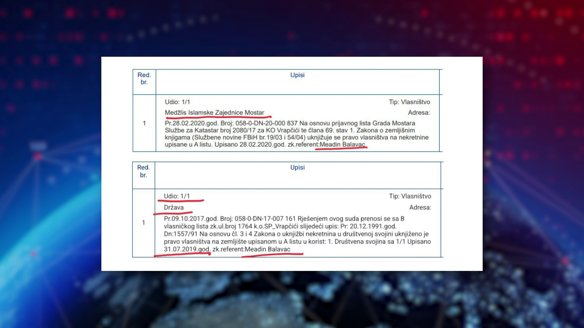 Зеница није усамљен случај, јер документација открива сличан образац и у Мостару. У оба града спорне уписе на „државу“ вршио је исти земљишнокњижни референт – Меадин Балавац. Док су у катастарској општини Врапчићи поједине парцеле преношене у државно власништво, у истом периоду и од стране истог референта, имовина Меџлиса Исламске заједнице Мостар књижена је као приватно власништво један кроз један.