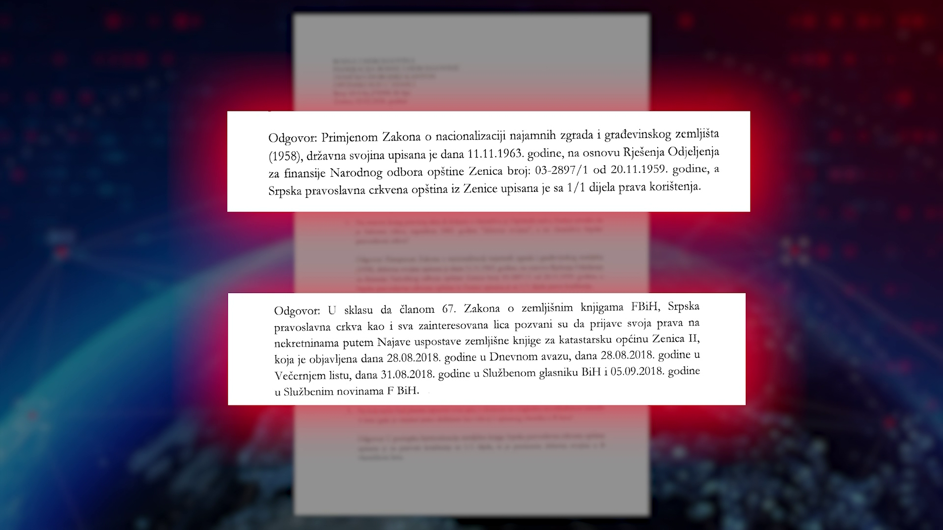 “Српска православна црква, као и сва лица, позвани су да пријаве своја права путем Најаве успоставе земљишне књиге објављене у августу и септембру 2018. године у Дневном авазу, Вечерњем листу, те Службеним гласницима БиХ и Федерације”.