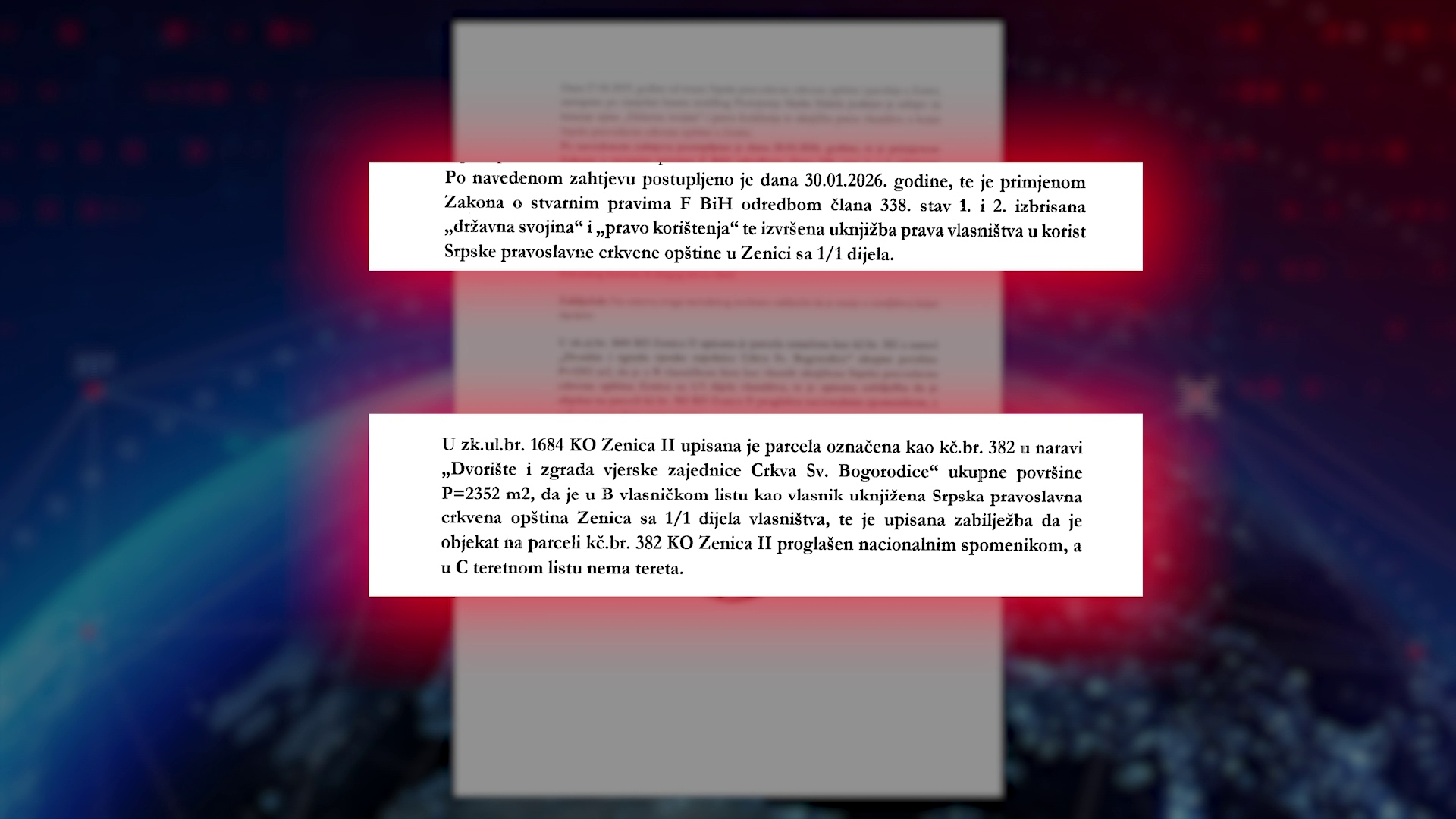 “По наведеном захтјеву Општински суд у Зеници поступио је 30. јануара 2026. године. Примјеном Закона о стварним правима Федерације БиХ, избрисана је државна својина и извршена укњижба права власништва у корист Српске православне црквене општине у Зеници са удјелом један кроз један”, наводи се у одговору Суда.